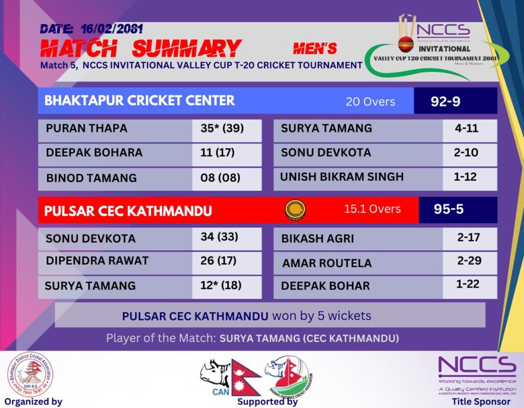 Surya Tamang took the highest 4 wickets for Kathmandu CEC. Sonu Devkota took two wickets and Unish Bikram Singh took one wickets for Bhaktapur Cricket Center