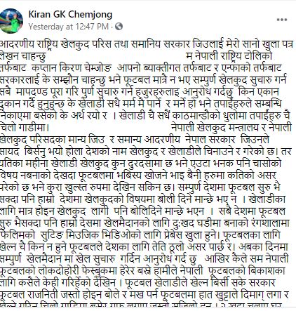 किरणले लेखेका छन्, “आदरणीय राष्ट्रिय खेलकुद परिषद् तथा सम्माननीय सरकारज्यूलाई सानो खुला पत्र लेख्न चाहन्छु । म नेपाली राष्ट्रिय टोलीका तर्फबाट कप्तान किरण चेम्जोङ आफ्नो व्याक्तिगत तर्फबाट र एन्फाको तर्फबाट सरकारलाई के सम्झाउन चाहन्छु भने फुटबल मात्रै नभएर सम्पूर्ण खेलकुद सुरु गर्न सबै मापदण्ड पूरा गरी पूर्ण रुपमा सुरु गर्न अनुरोध गर्दछु।” उनले सरकारलाई प्रश्न गरेका छन्, “किन एकान दुकान गर्दै हुनुहुन्छ ? के खेलाडी सधैं मर्नैपर्ने हो ? मर्ने हो भने तपाईंहरु सम्बन्धित निकायमा बसेको के अर्थ रह्यो र ? खेलाडी सधैं काठमाडौंको धुलोमा तपाईंहरु चैं चिलो गाडीमा ?”