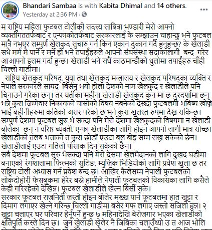 साबित्रा लेख्छिन: “म राष्ट्रिय महिला फुटबल टोलीकी सदस्य साबित्रा भण्डारी मेरो आफ्नो व्यक्तीगततर्फबाट र एन्फाकोतर्फबाट सरकारलाई के सम्झाउन चाहान्छु भने फुटबल मात्रै नभएर सम्पुर्ण खेलकुद सुचारु गर्न किन एकान दुकान गर्दै हुनुहुन्छ? के खेलाडी सधै मर्म मै पार्ने र मर्ने हो भने तपाईंहरुले आपनो संघसंस्था सदाकालागी बन्द गरेर आआफ्नो इलम गर्दा हुन्छ। खेलाडी भने सधैं काठमान्डौको धुलोमा तपाईंहरु चाँही चिल्लो गाडीमा। राष्ट्रिय खेलकुद परिषद्, युवा तथा खेलकुद मन्त्रालय र खेलकुद परिषद्का व्यक्ति र नेपाल सरकारले सायद बिर्सनु भयो होला देशको नाम खेलकुद र खेलाडीले पनि चिनाउने गरेका छन्। तर यतीका महीना खेलाडी खेलकुद कुन मा छ दुुरदर्शामा छन् भन्ने कुरा जिम्मेवार निकायको चासोको विषय नबनेको देख्दा फुटबलमा भबिष्य खोज्ने भाई बहीनीहरुमा कतिको असर परेको छ भने कुरा खुलस्त रुपमा देख्न सकिन्छ। सम्पुर्ण देशमा फूटबल सुरु भै सक्दा पनि मेरो देशमा खेलकुदको विषयमा न खेलाडी बोलेका छन् न वरिष्ठ ब्यक्ती, एन्फा खेलाडीका लागि होइन आफ्नो लागी मात्र सोच्छ। खेलाडीको तलब भत्ताको त कुरा छोडौं एउटा बल बोइ सम्म राख्न सकेको छैन। खेलाडीलाई एउटा गतिलो पोसाक दिन सकेको छैन। सबै देशमा फूटबल सुरु भैसक्दा पनि मेरो देसमा खेलमैदानको लागि दुखद घडीमा बनाएको रंगशालामा फिल्मको सुटिङ, म्युजिक भिडियोको लागि प्रवेश खुला छ तर राष्ट्रिय टोली अभ्यास गर्न प्रवेश बन्द छ। आखिर कैलेसम्म नेपाली फुटबलको लोकदोहोरी फेसबुकमा हेरेर बस्ने हामीले नेपाली फूटबलको विकासका लागि कसैले केही गरिरहेको देखिन्न। फूटबल खेलाडीले खेल्न बिर्सी सके। सरकार फूटबल राजनिती जस्तो होइन बोलेर मख्ख पार्न फूटबलमा हात खुट्टा र दिमाग लगाएर खेल्ने गरिन्छ चिल्लो गाडीमा बसेर गफ लगाए जस्तो सजिलो हुन्न। २ खुट्टा चलाएर घर परिवार हेर्नूपर्ने हुन्छ ७ महिनादेखि बेरोजगार भएका खेलाडीको क्षतिपुर्ति कस्ले दिन छ। जुन खेलाडी खेलेर नै जिबिका चलाउँथ्यो उ त आज भोलि खेलमैदान छोडेर विदेश पो जाँदै छ यस्तै अवस्था रहिरहे कुनै दिन म पनि विदेश जान बाध्य हुनेछु। यो त लाज हुने कुरा होइन र खेलकुदका पदाधिकारी राज्यका माननिय ज्यु। जय देश, जय देश, जय नेपाली फूटबल।”