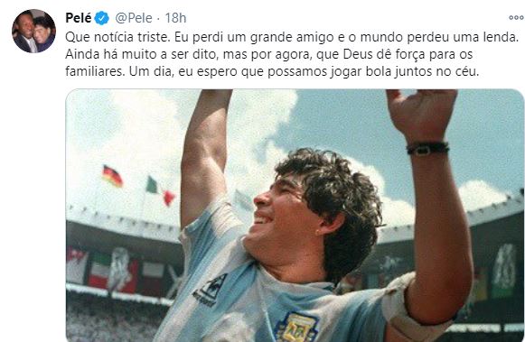 म्यारोडोनाको निधनपछि सामाजिक संजाल ट्वीटरबाट पेलेले पनि श्रदान्जलि व्यक्त गरेका छन्।आफूले महान साथी गुमाएको बताउँदै ८० वर्षीय पेलेले एक दिन आकाशमा बल खेल्ने बताएका छन् ।
