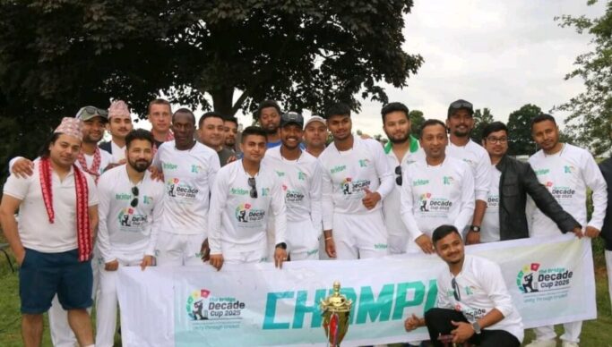 Sandeep Lamichhane’s team, Bridge-11, has won the title of The Bridge Decade Cup 2025. In the second friendly cricket match held at the Devizes Cricket Club ground in Wilshere, Bridge-11 defeated Devizes Cricket Club by 127 runs to win the title.